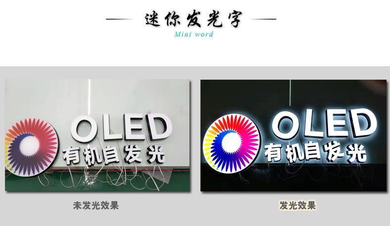 迷你發光字:采用高分子亞克力材料制成,側面高精度三維雕刻,超高亮度且發光均勻,持久耐用。整個招牌精致小巧,可通過烤漆、UV彩印等技術實現多種效果。
